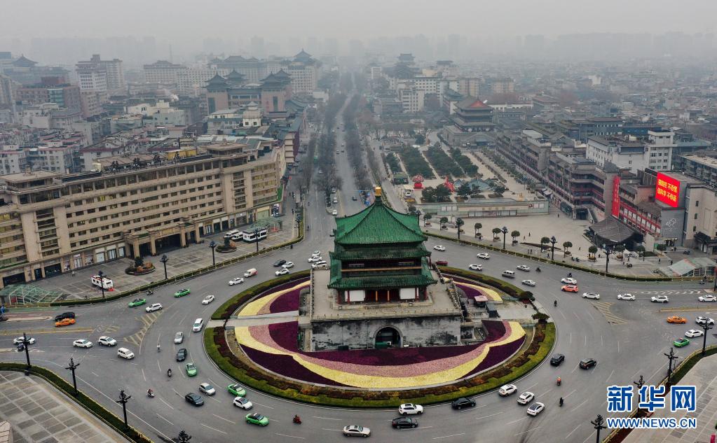 1月22日,西安市鐘樓盤道再現車水馬龍的景象(無人機照片)。新華社記者 陶明 攝
