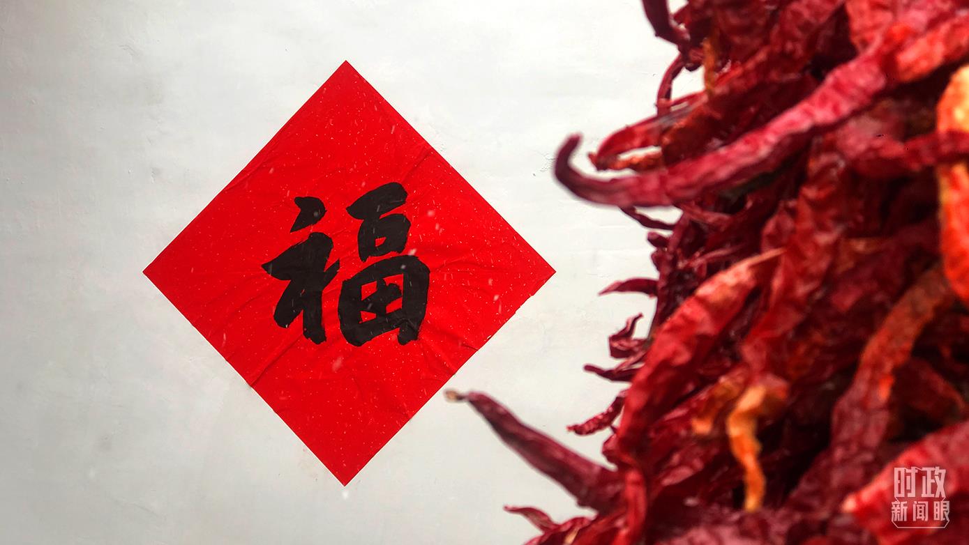△村民院中晾曬的紅辣椒與福字相映成趣。(總臺(tái)央視記者石偉明拍攝)