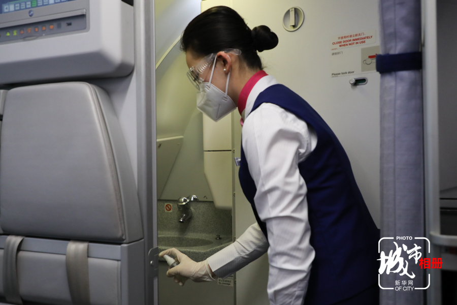 為飛機(jī)的廁所等重要部位進(jìn)行消毒也是徐秋月和同事們的必備課。除了這些日常的防護(hù),徐秋月還要組織乘務(wù)組進(jìn)行應(yīng)急演練,確保每一位乘務(wù)員在遇到發(fā)熱乘客時(shí)都能立即正確應(yīng)對(duì)。新華網(wǎng)發(fā)(黃勇 攝)陳雨 文