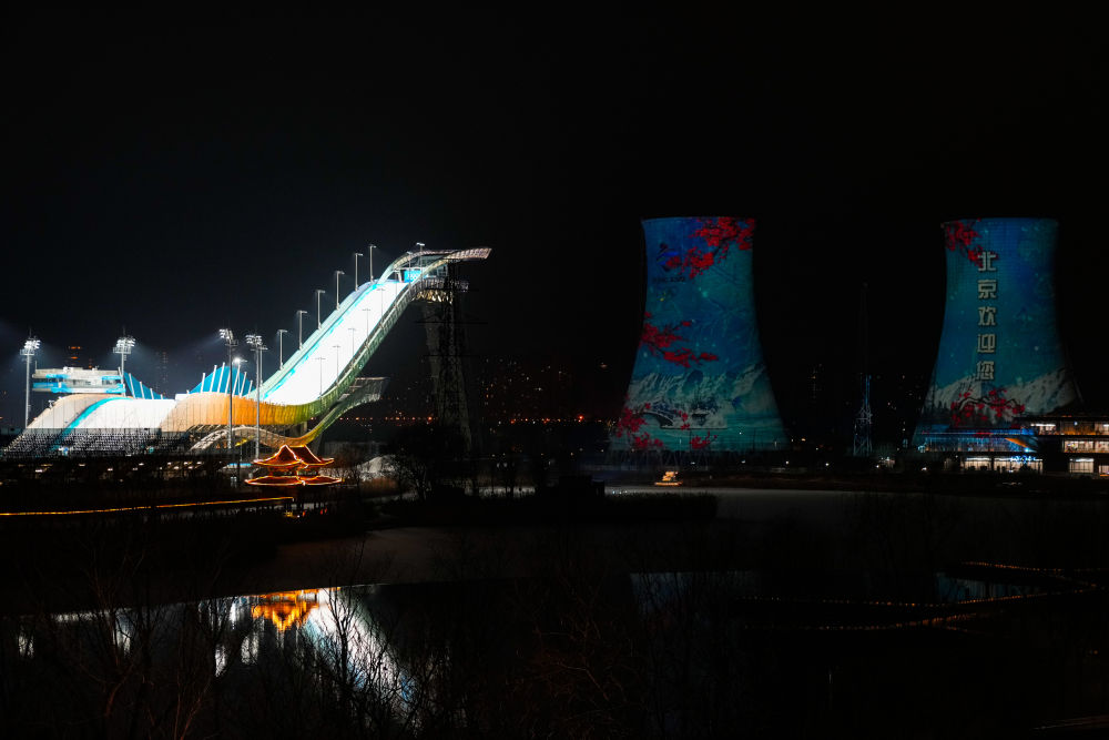 1月20日,位于北京市石景山區(qū)首鋼園內(nèi)的首鋼滑雪大跳臺(tái)開啟燈光秀。新華社記者 彭子洋 攝