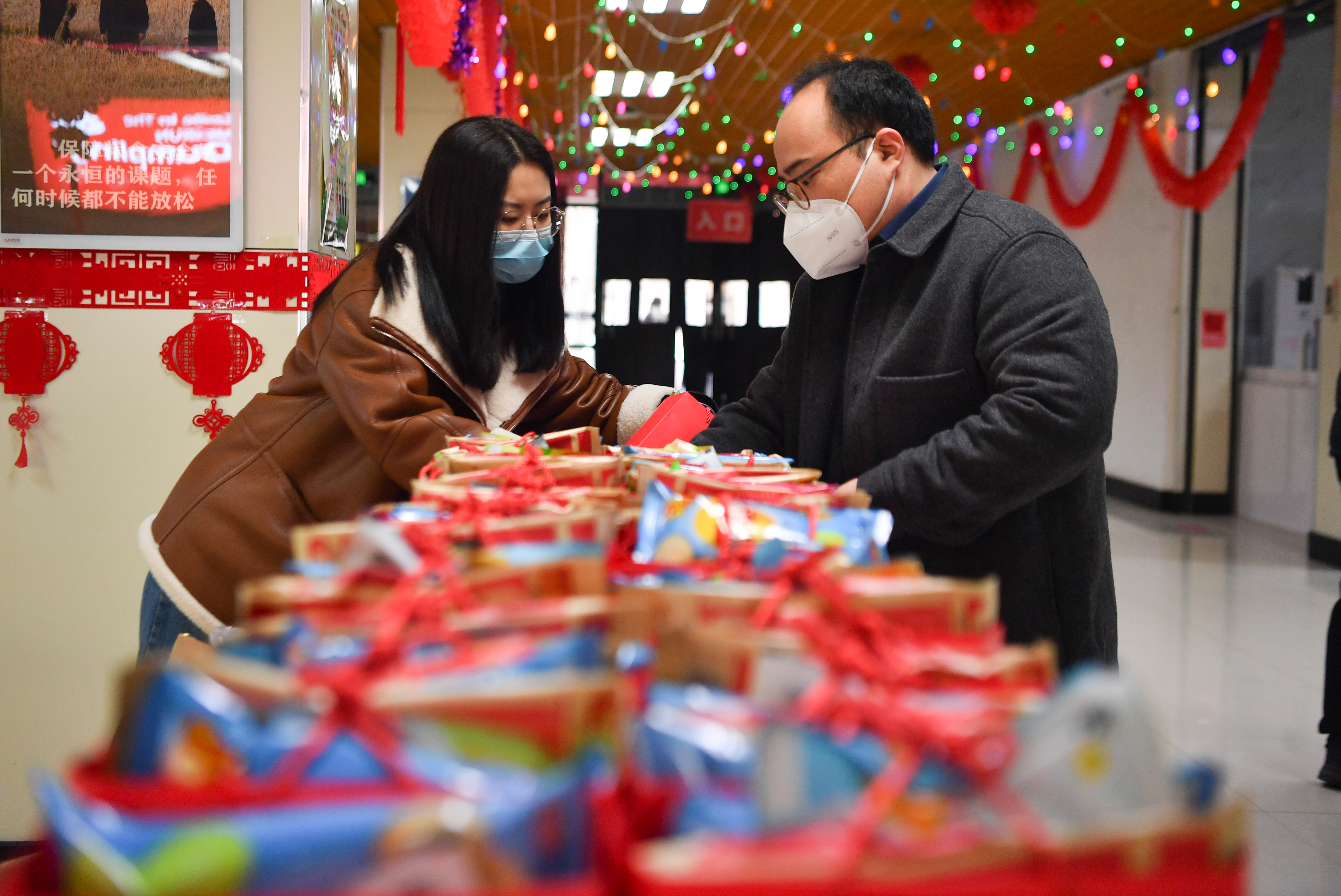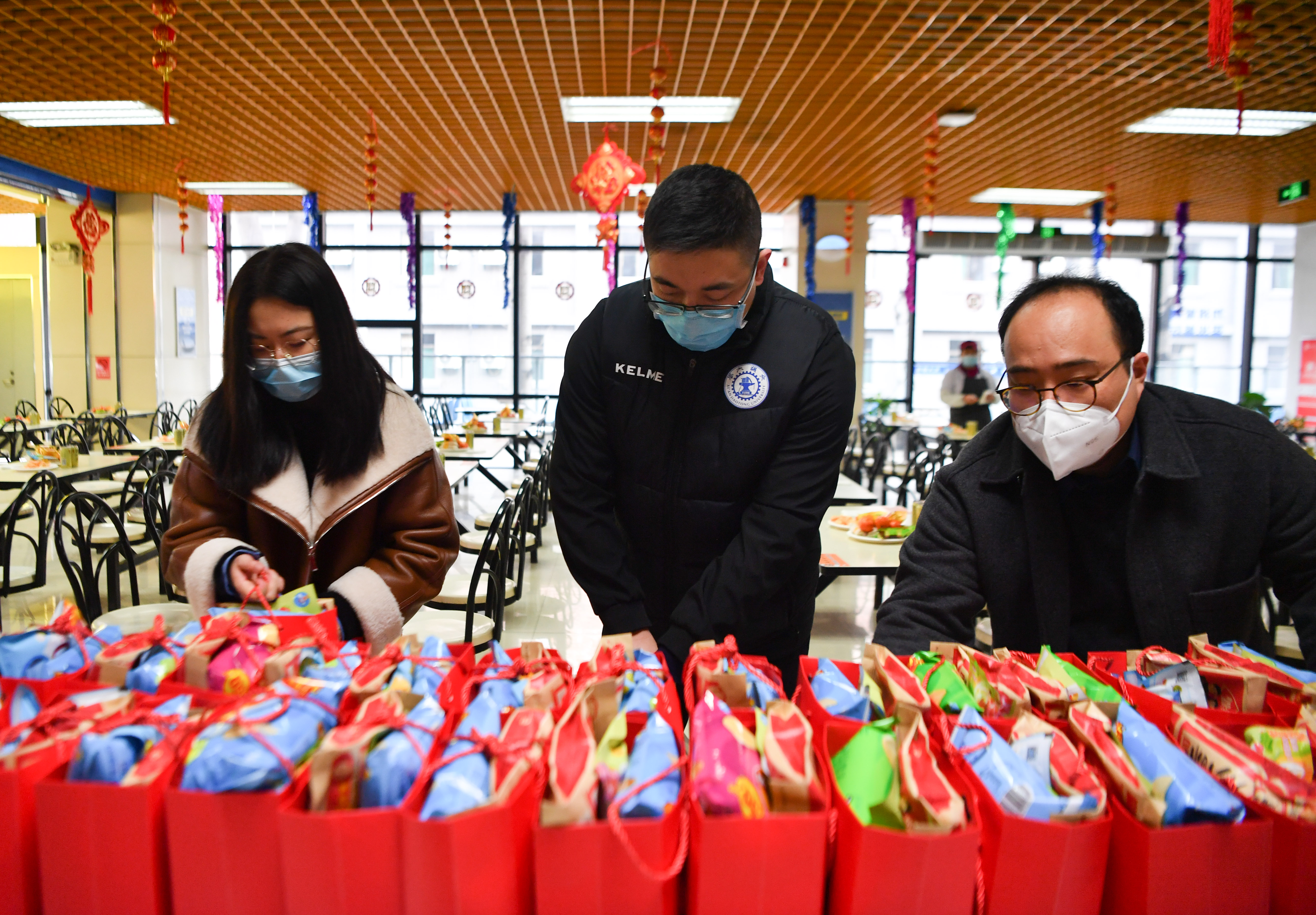1月29日,工作人員在西安交通大學(xué)興慶校區(qū)整理為留校學(xué)生發(fā)放的禮包。新華社記者 張博文 攝