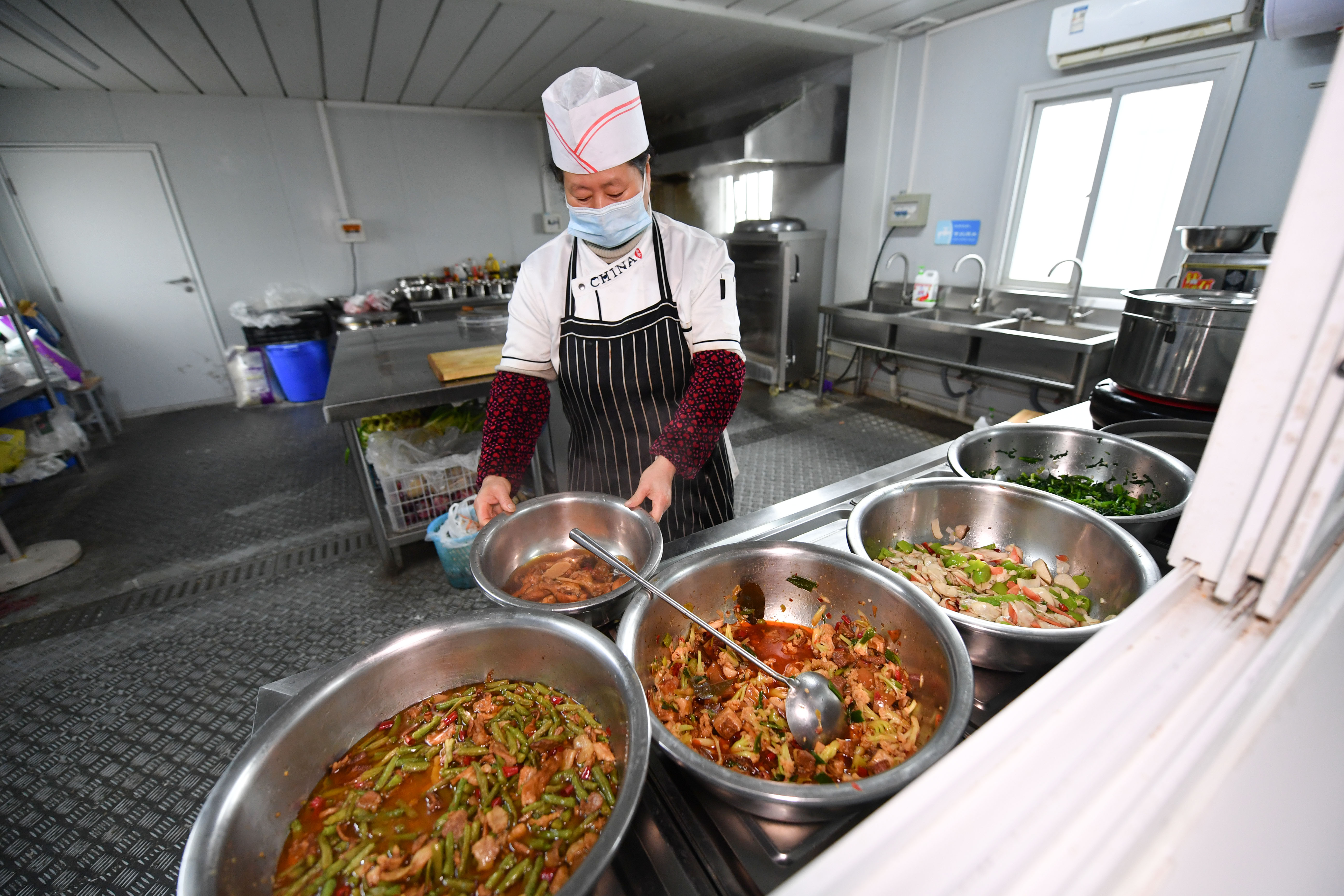 1月30日,在西安市第一實(shí)驗(yàn)學(xué)校建設(shè)項(xiàng)目工地,留守工地的廚師在廚房準(zhǔn)備午餐。