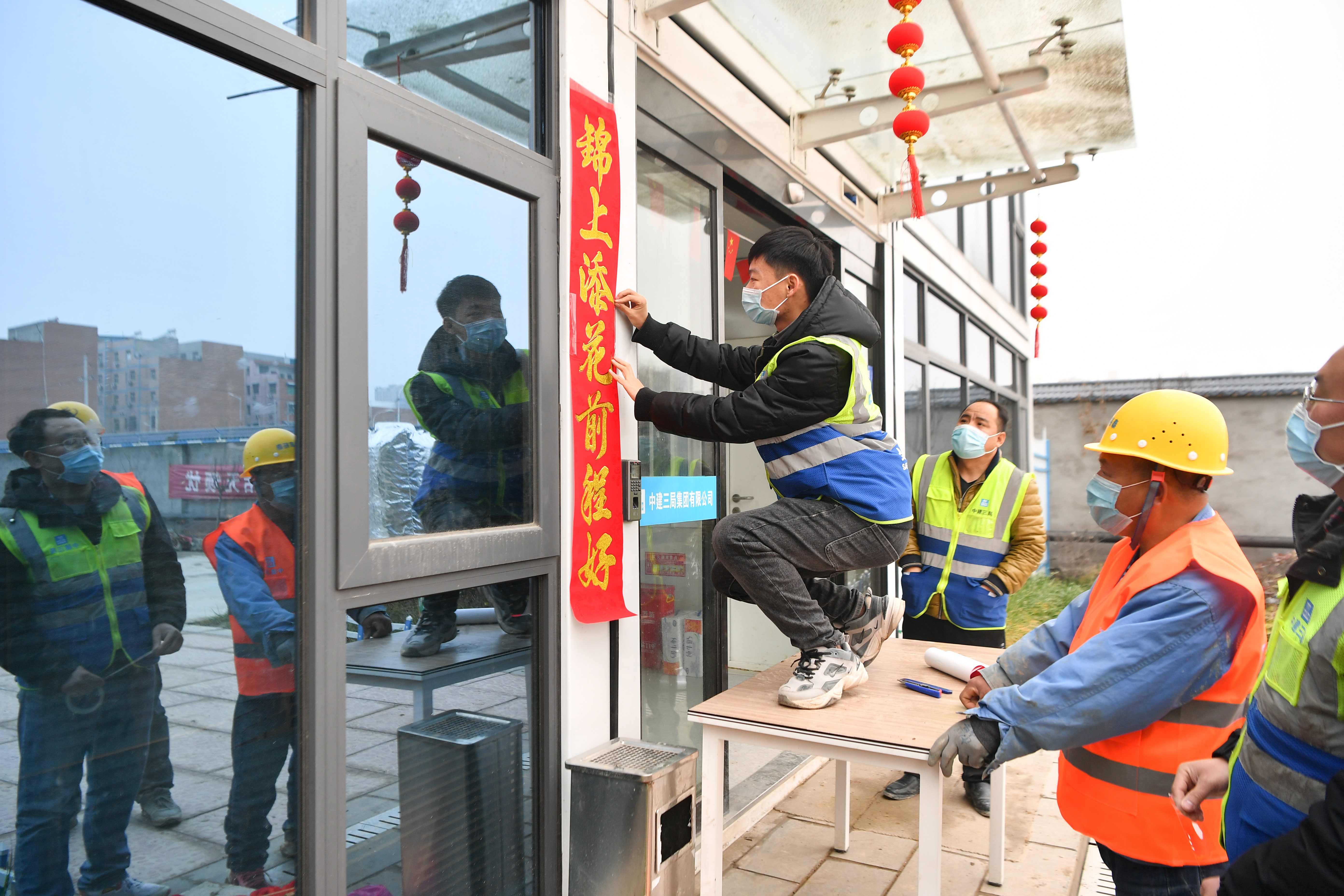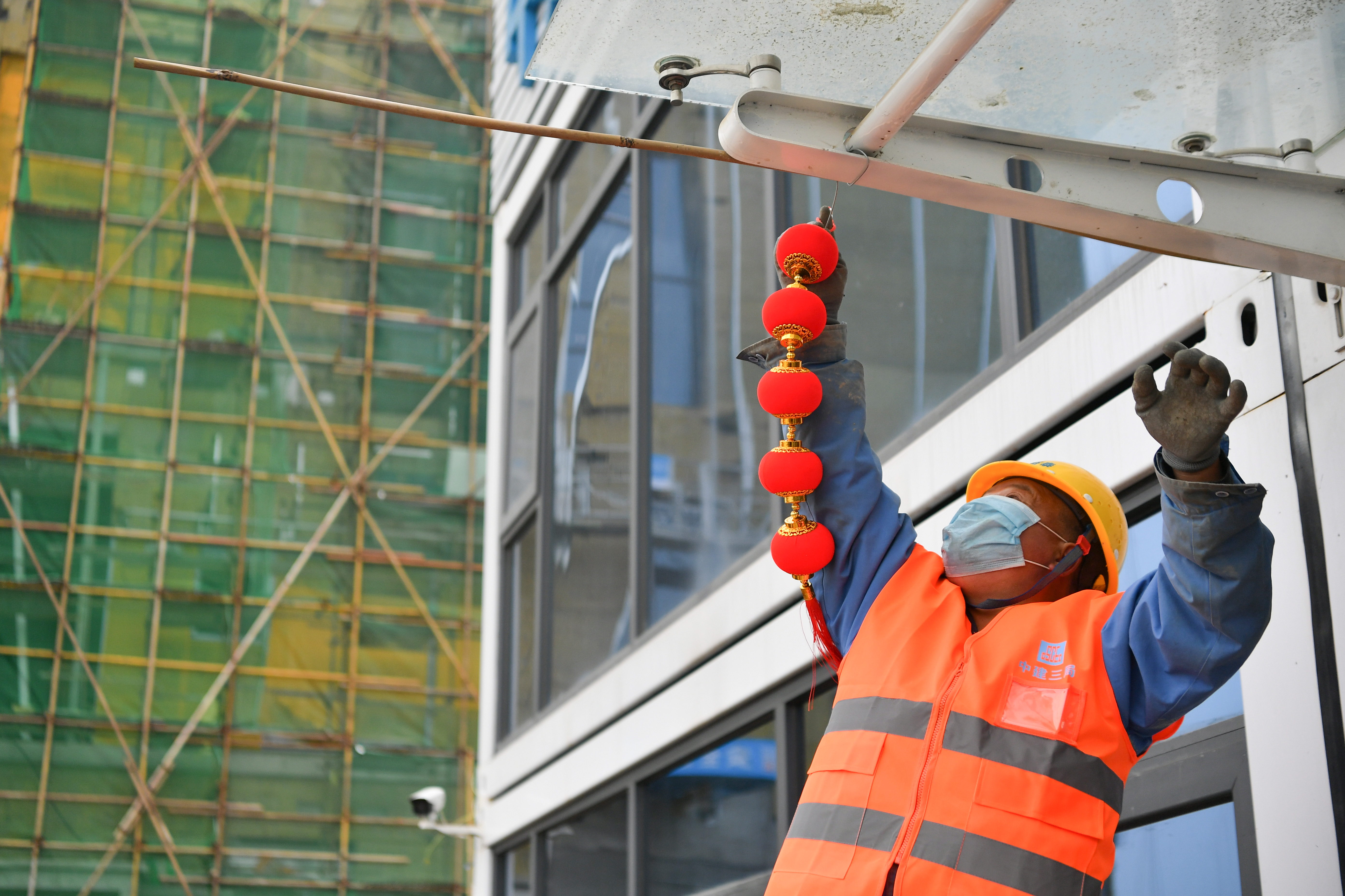 當(dāng)日是農(nóng)歷臘月二十八,在陜西省西安市第一實(shí)驗(yàn)學(xué)校建設(shè)項(xiàng)目工地,留守工地的建設(shè)者用貼春聯(lián)、掛燈籠等方式,迎接佳節(jié)的到來。