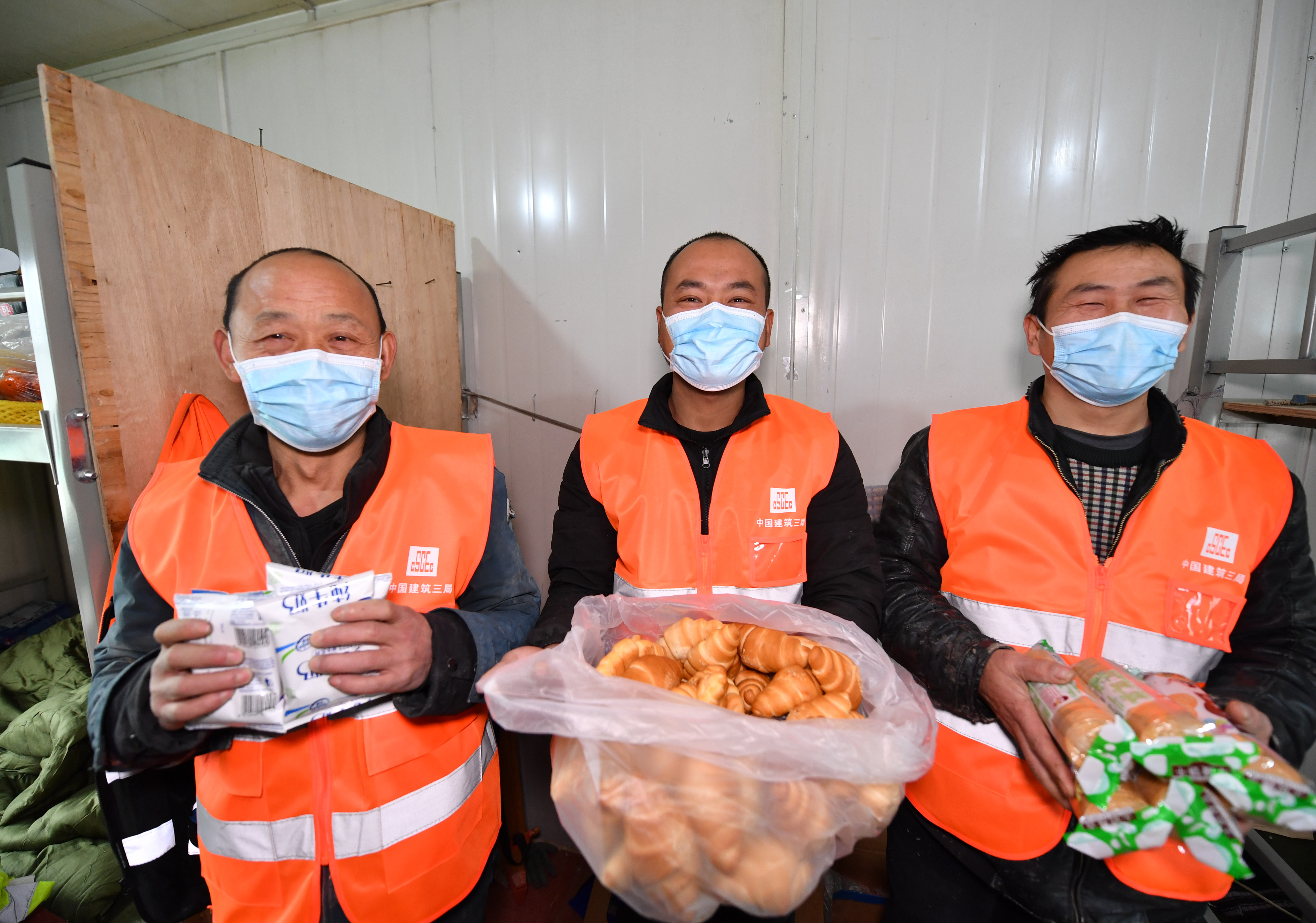 1月30日,在西安市第一實(shí)驗(yàn)學(xué)校建設(shè)項(xiàng)目工地,留守工地的工人展示建設(shè)方發(fā)放的生活物資。新華社記者 張博文 攝