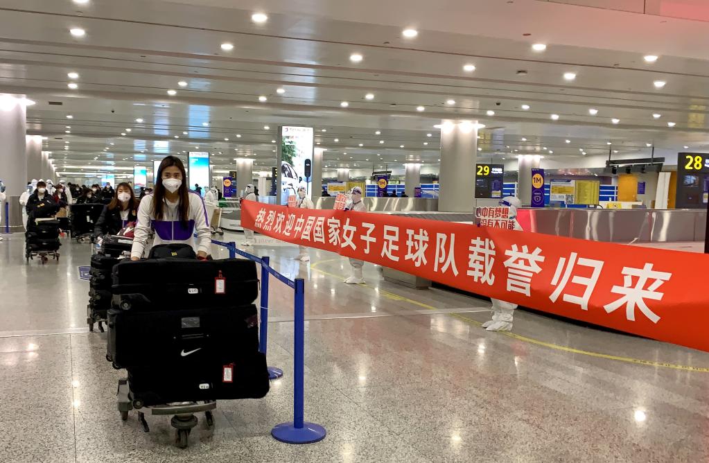2月7日,中國女足隊員抵達上海浦東國際機場。新華社發(fā)(中國東方航空供圖)