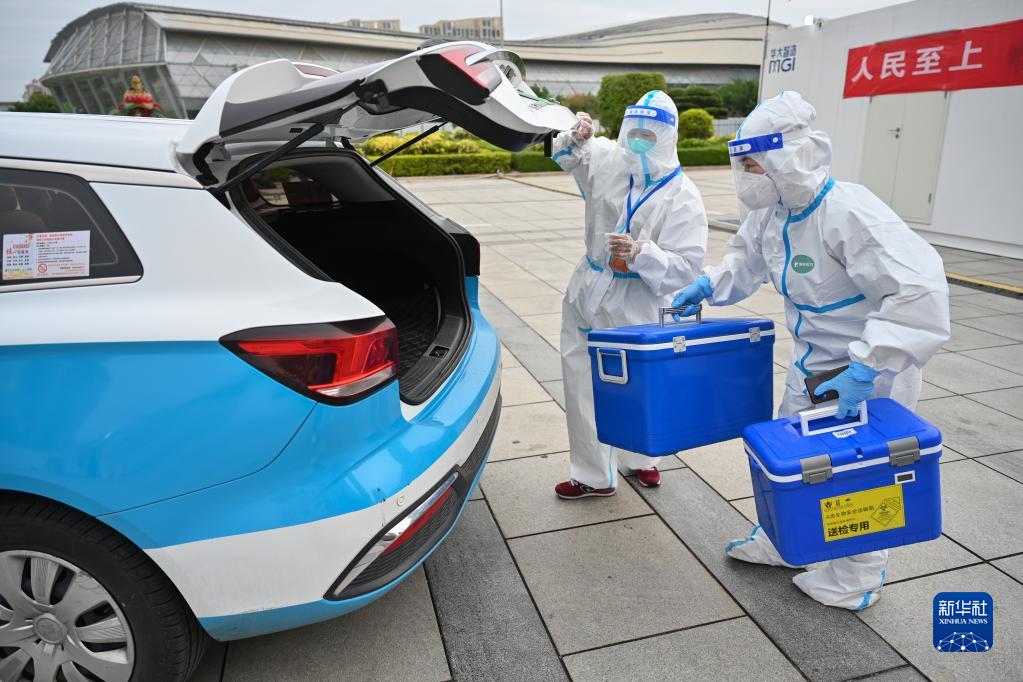 3月24日,在福建泉州市海峽體育中心聯(lián)合方艙核酸檢測(cè)基地,參加“抗疫志愿車隊(duì)”的出租車司機(jī)(左)協(xié)助醫(yī)務(wù)人員裝運(yùn)核酸檢測(cè)樣本。新華社發(fā)(周義攝)