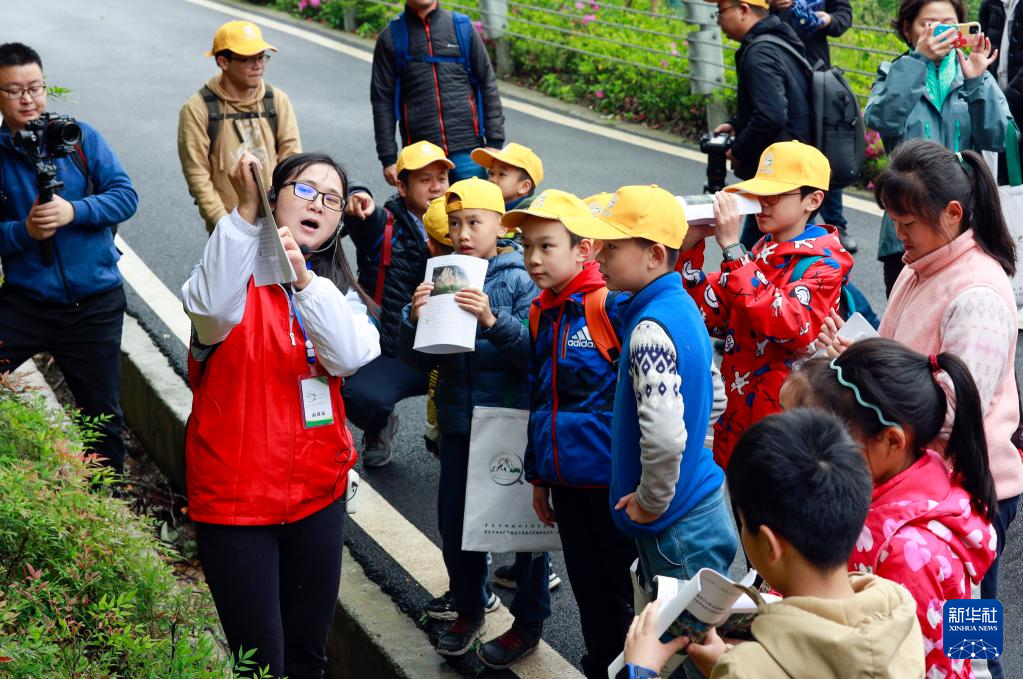 4月17日,一名地質(zhì)專業(yè)工作人員在為參加活動的中小學(xué)生講解銅鑼山的地質(zhì)構(gòu)造。