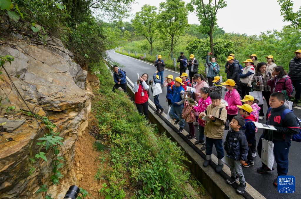 4月17日,參加活動的地學(xué)旅游愛好者、中小學(xué)生和部分媒體工作者,在地質(zhì)專業(yè)工作人員的帶領(lǐng)下進行銅鑼山科學(xué)考察。