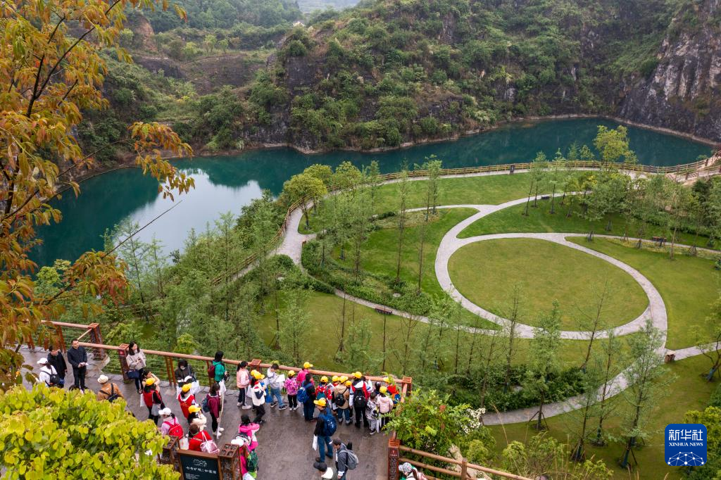 4月17日,地學(xué)旅游愛好者、中小學(xué)生和部分媒體工作者在地質(zhì)專業(yè)工作人員的帶領(lǐng)下,對銅鑼山礦山公園的地質(zhì)遺跡和生態(tài)修復(fù)進行科學(xué)考察(無人機照片)。