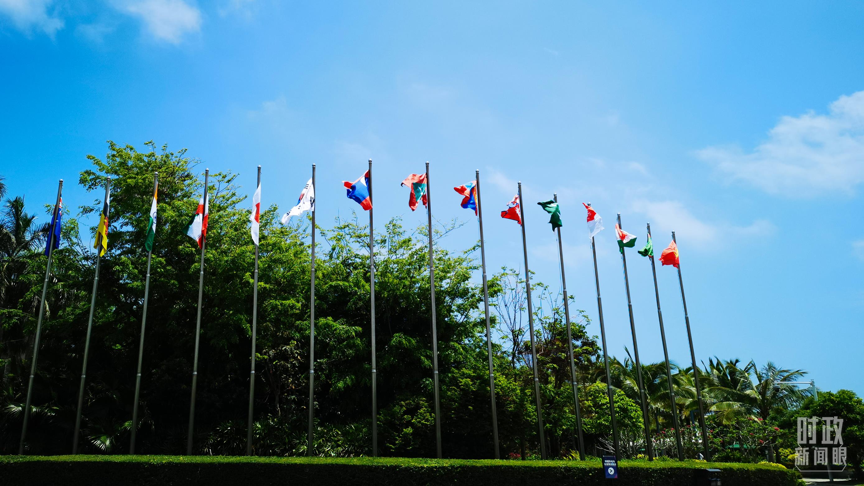 △多國(guó)國(guó)旗飄揚(yáng)在博鰲亞洲論壇國(guó)際會(huì)議中心外。(總臺(tái)記者許云拍攝)