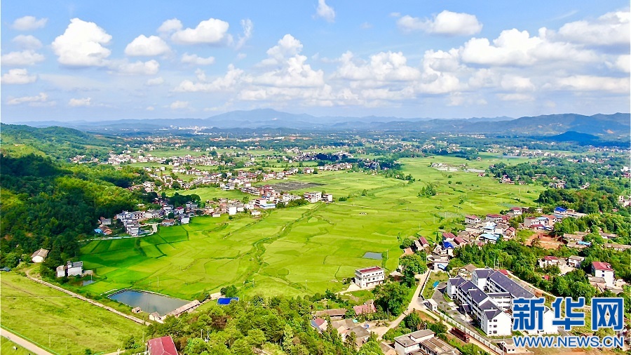 在江西省宜春市袁州區(qū)慈化鎮(zhèn)模山村,高標準農(nóng)田內(nèi)水網(wǎng)縱橫交錯,與村落、遠山形成一幅美麗動人的鄉(xiāng)村畫卷。新華網(wǎng)發(fā) 劉卿 攝