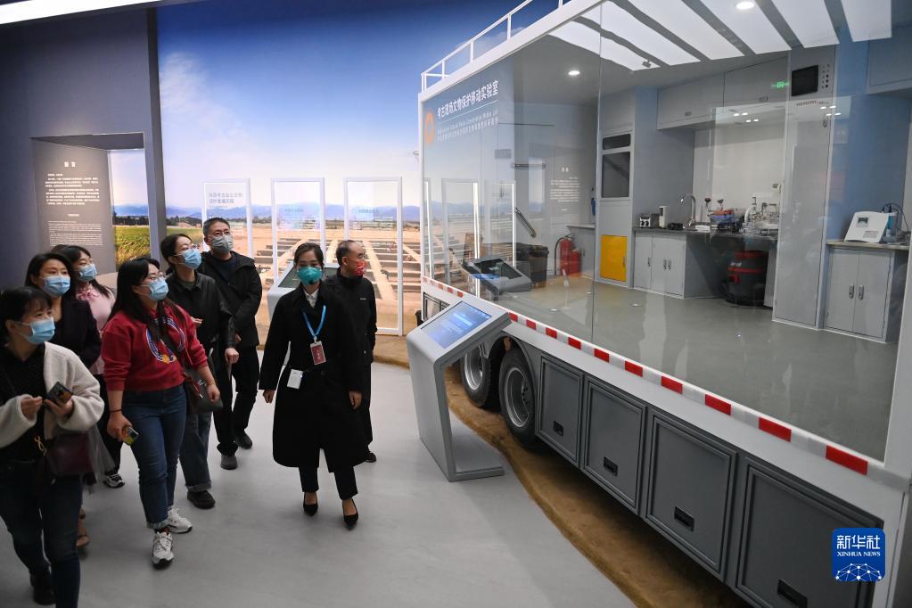 4月28日,游客在陜西考古博物館內參觀考古現(xiàn)場文物保護移動實驗室。新華社記者 李一博 攝