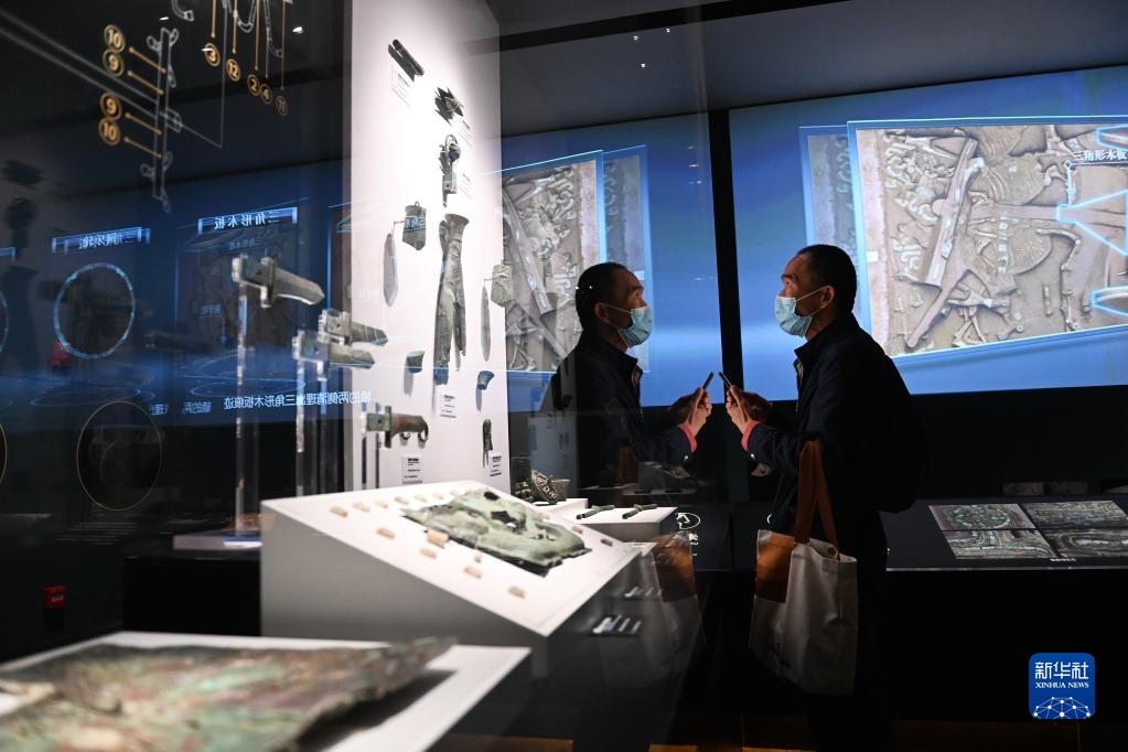 4月28日,游客在陜西考古博物館內參觀寶雞周原遺址出土的銅輪牙馬車車飾。新華社記者 李一博 攝