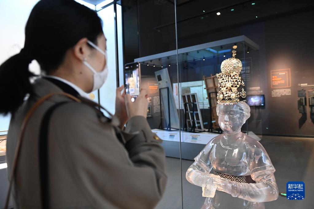 4月28日,游客在陜西考古博物館內拍攝唐代李倕冠飾。新華社記者 李一博 攝