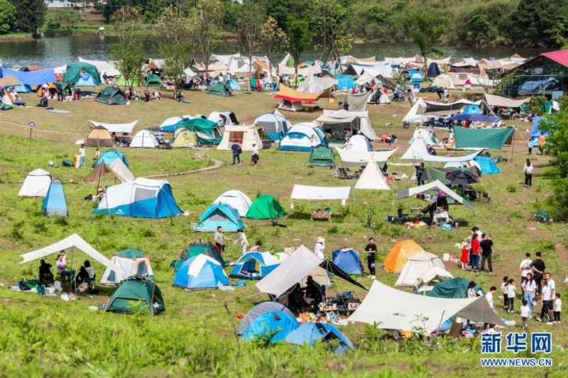 5月3日,人們?cè)谥貞c市南川區(qū)黎香湖國(guó)家濕地公園露營(yíng)基地搭帳篷游玩。新華社發(fā)(瞿明斌攝)