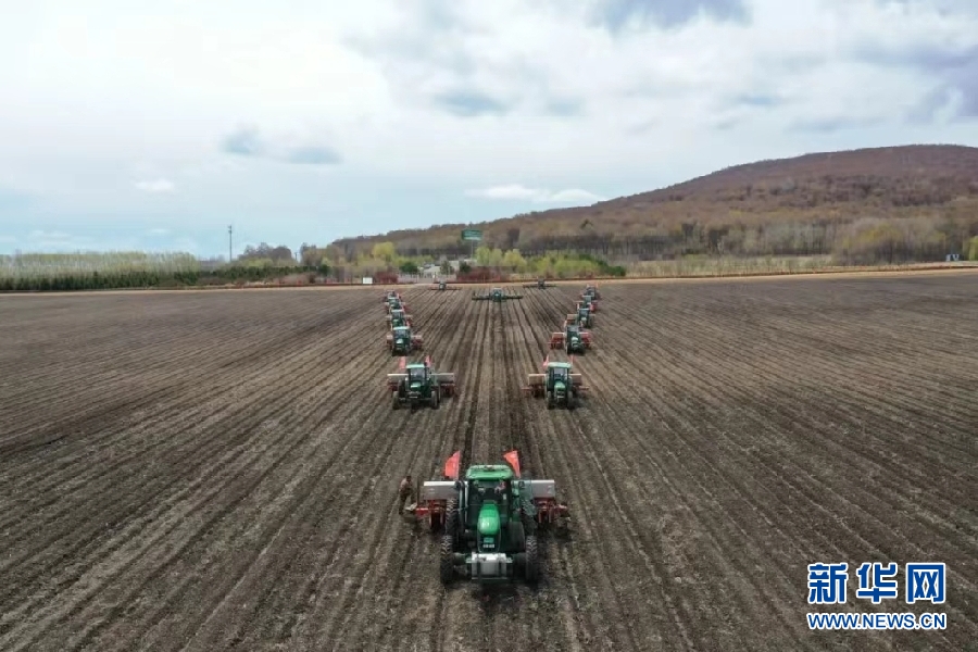 北大荒集團建三江分公司八五九農(nóng)場有限公司數(shù)十臺大馬力巨無霸農(nóng)機在田間播種大豆。新華網(wǎng)發(fā)(李明達 攝)