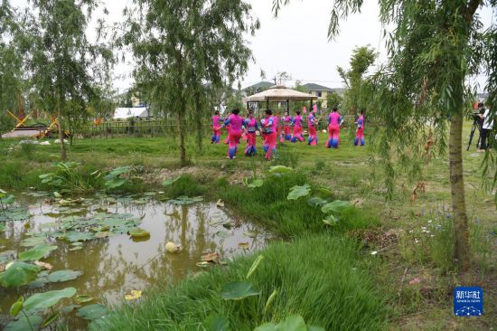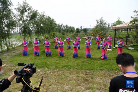 5月15日,肥西縣柿樹崗鄉(xiāng)村民通過“云上”直播表演當?shù)貍鹘y(tǒng)非遺文化項目蓮湘舞。新華社記者劉軍喜攝
