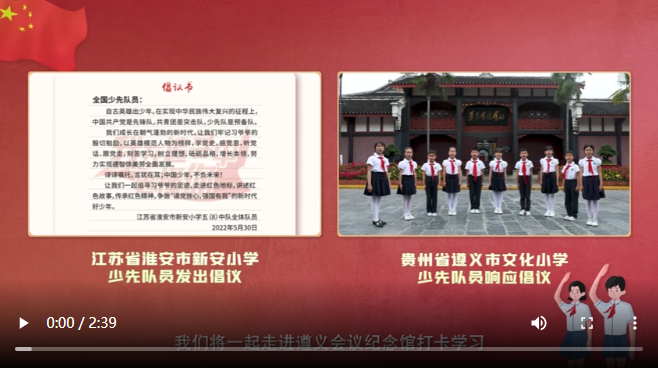 2022年5月30日,是江蘇省淮安市新安小學(xué)少先隊(duì)員們收到習(xí)近平總書記回信一周年的日子。近日,他們向全國少先隊(duì)員發(fā)出“跟著習(xí)爺爺?shù)淖阚E學(xué)黨史”的倡議。貴州省遵義市文化小學(xué)的少先隊(duì)員們第一時(shí)間響應(yīng)倡議,追尋習(xí)爺爺?shù)淖阚E,打卡遵義會(huì)議紀(jì)念館,講述紅色故事,傳承紅色基因。