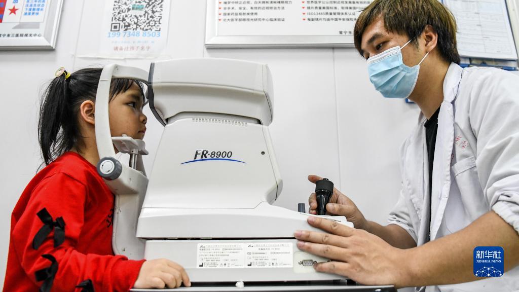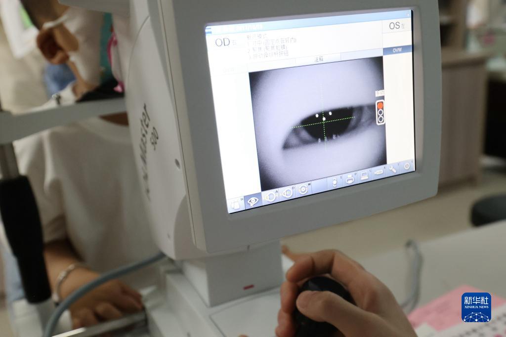 6月5日,湖南省常寧市第三人民醫(yī)院的醫(yī)護(hù)人員在為小朋友驗(yàn)光。新華社發(fā)(周秀魚春 攝)