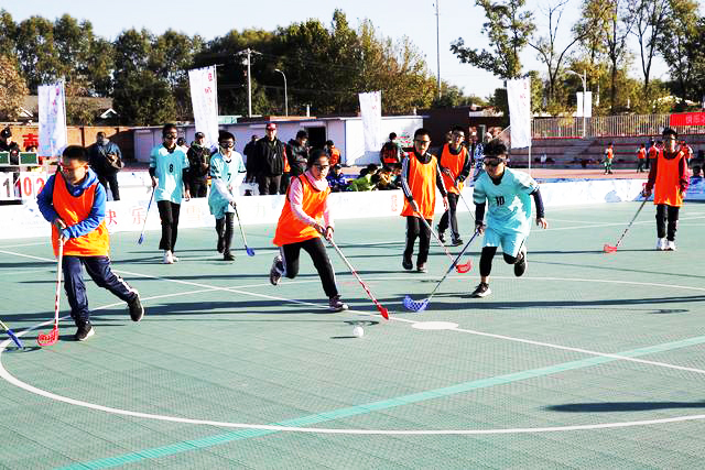 2021年10月17日,北京舉行中小學(xué)生旱地冰球比賽,圖為參賽學(xué)生在比賽中。新華社發(fā)(周良 攝)