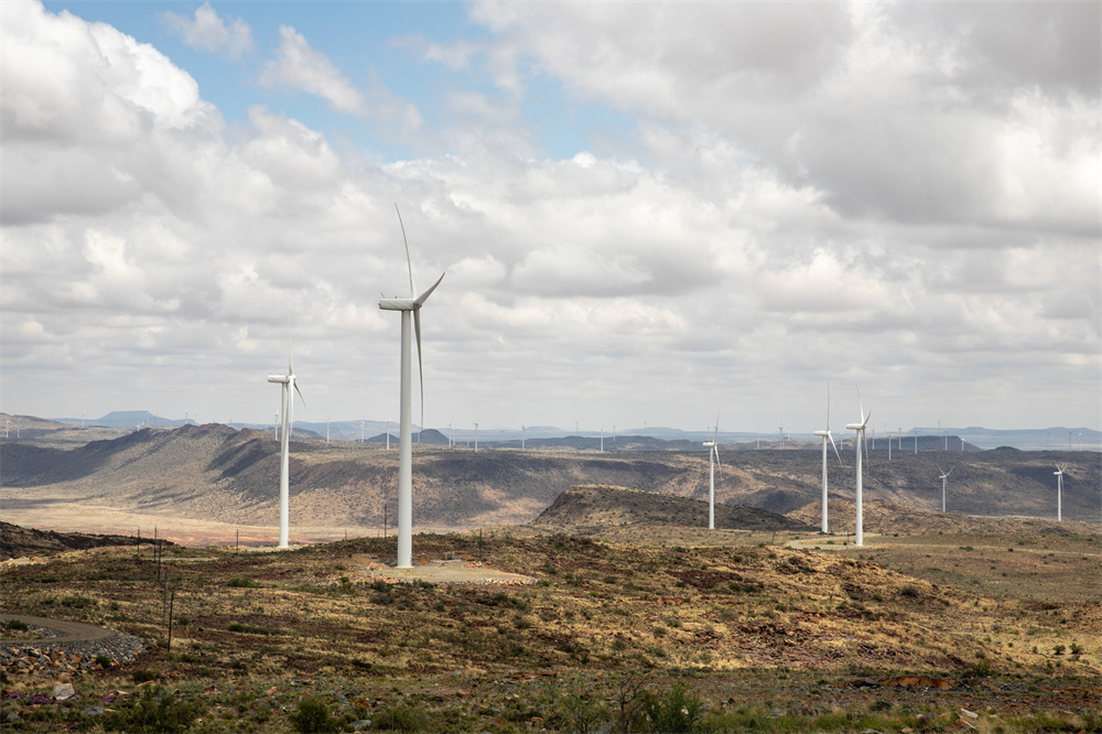 這是2021年11月22日在南非北開普省德阿鎮(zhèn)拍攝的中國龍源電力集團南非公司運營的德阿風(fēng)電項目風(fēng)機。新華社記者 呂天然 攝