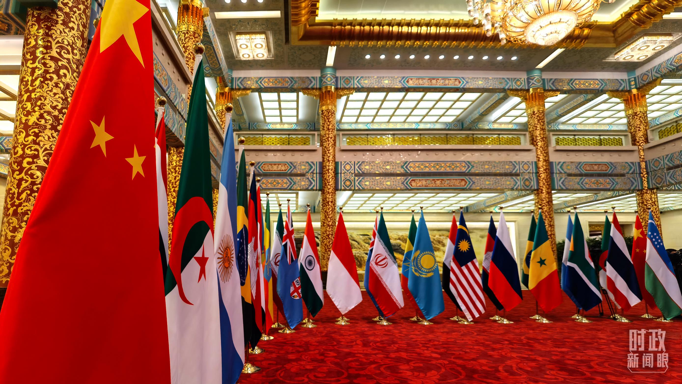 全球發(fā)展高層對(duì)話會(huì)的中方會(huì)場(chǎng),設(shè)在人民大會(huì)堂金色大廳。林立的參會(huì)國(guó)旗幟、紅色的地毯,映襯著會(huì)議的熱度。
