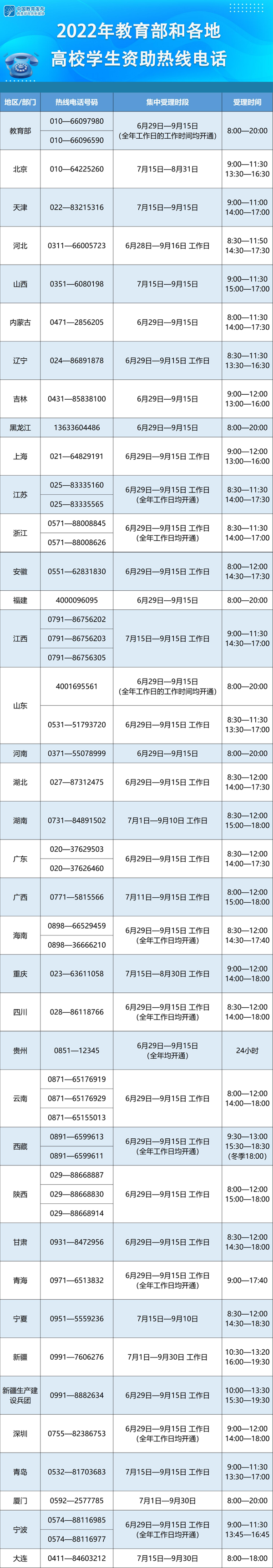教育部要求各?。▍^(qū)、市)及所屬高校、中央高校學(xué)生資助管理部門均開通熱線電話,并結(jié)合實(shí)際情況自行確定集中受理時段和具體受理時間。