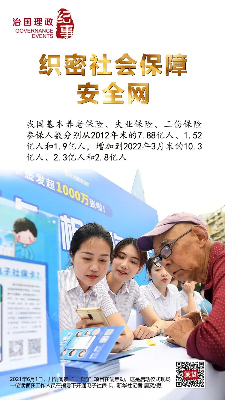 我國基本養(yǎng)老保險、失業(yè)保險、工傷保險參保人數(shù)分別從2012年末的7.88億人、1.52億人和1.9億人,增加到2022年3月末的10.3億人、2.3億人和2.8億人。近1億貧困人口實現(xiàn)基本醫(yī)療有保障,6098萬建檔立卡貧困人口參加基本養(yǎng)老保險,參保率穩(wěn)定在99.99%以上,基本實現(xiàn)應(yīng)保盡保。