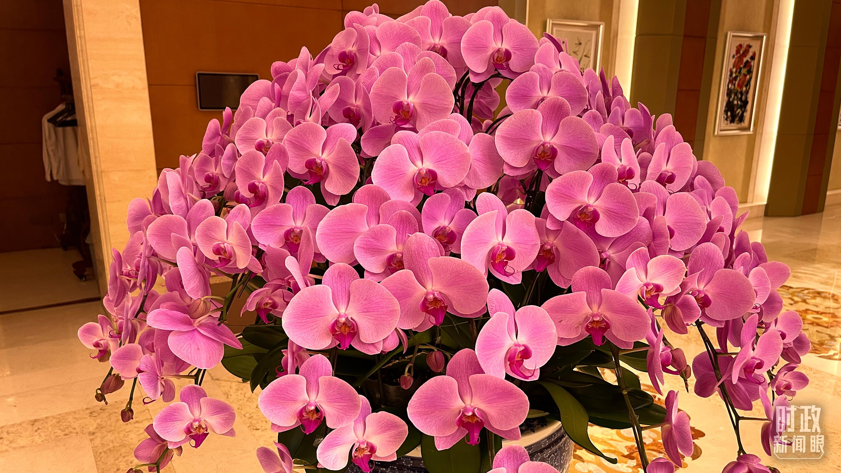 △釣魚臺國賓館芳華苑內(nèi)擺放的蝴蝶蘭,印尼是蝴蝶蘭的重要產(chǎn)地之一。(總臺央視記者鄂介甫拍攝)
