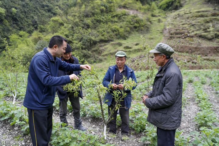 在重慶市巫溪縣天元鄉(xiāng)萬春村,專家團(tuán)隊成員王大平(左一)對村民進(jìn)行冬桃樹苗整形壓枝培訓(xùn)(2020年4月23日攝)。新華社記者 黃偉 攝