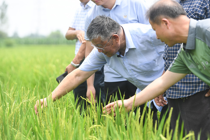 在江蘇省句容市天王鎮(zhèn)戴莊村,農(nóng)業(yè)專家趙亞夫(中)帶著團(tuán)隊成員查看有機(jī)水稻長勢(2021年7月6日攝)。新華社記者 季春鵬 攝