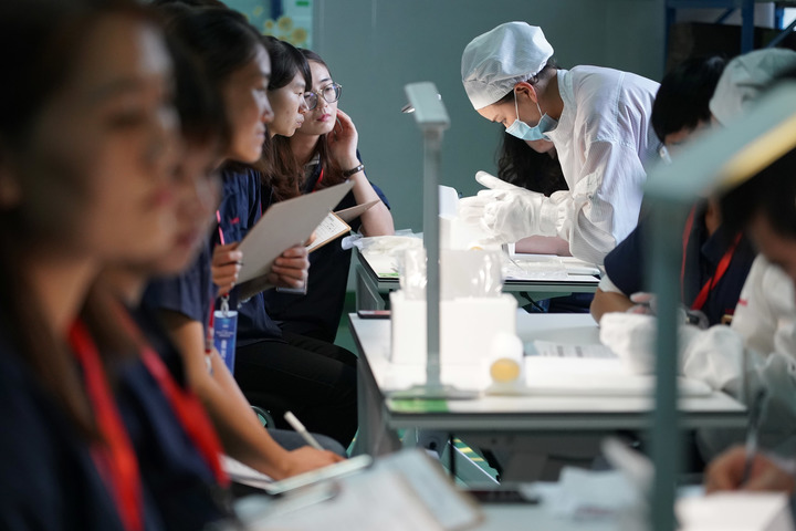 在西安市2019年高技能人才技能大賽暨新能源新材料技能競賽決賽上,參賽選手(右)現(xiàn)場查看硅片的外觀(2019年9月5日攝)。新華社記者 邵瑞 攝