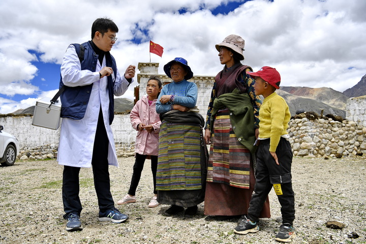 在西藏拉薩市當(dāng)雄縣格達(dá)鄉(xiāng)格達(dá)村,第六批醫(yī)療人才“組團(tuán)式”援藏專家王克明(左一)為村民講解健康知識(2021年6月19日攝)。新華社記者 張汝鋒 攝