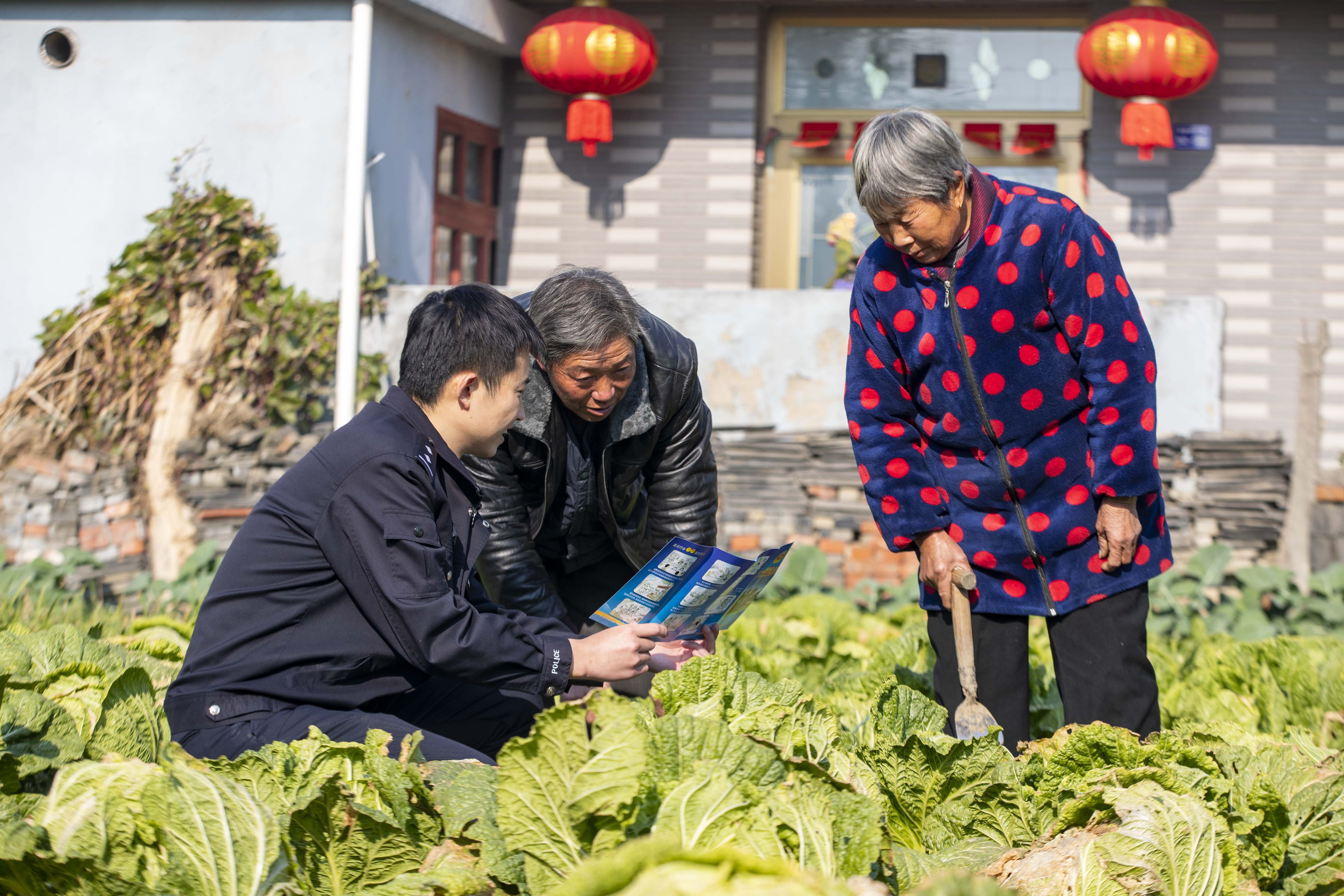 江蘇省泰州市海陵區(qū)蘇陳派出所民警在蘇陳社區(qū)田間地頭向農(nóng)戶進行普法宣傳(2021年12月4日攝)。新華社發(fā)(湯德宏 攝)