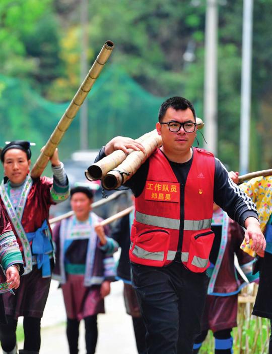 廣西柳州市融水苗族自治縣桿洞鄉(xiāng)黨鳩村脫貧攻堅(jiān)(鄉(xiāng)村振興)工作隊(duì)員鄭昌昊和婦女們?nèi)趧?dòng)(2021 年 4 月 20 日攝)黃孝邦攝 / 本刊
