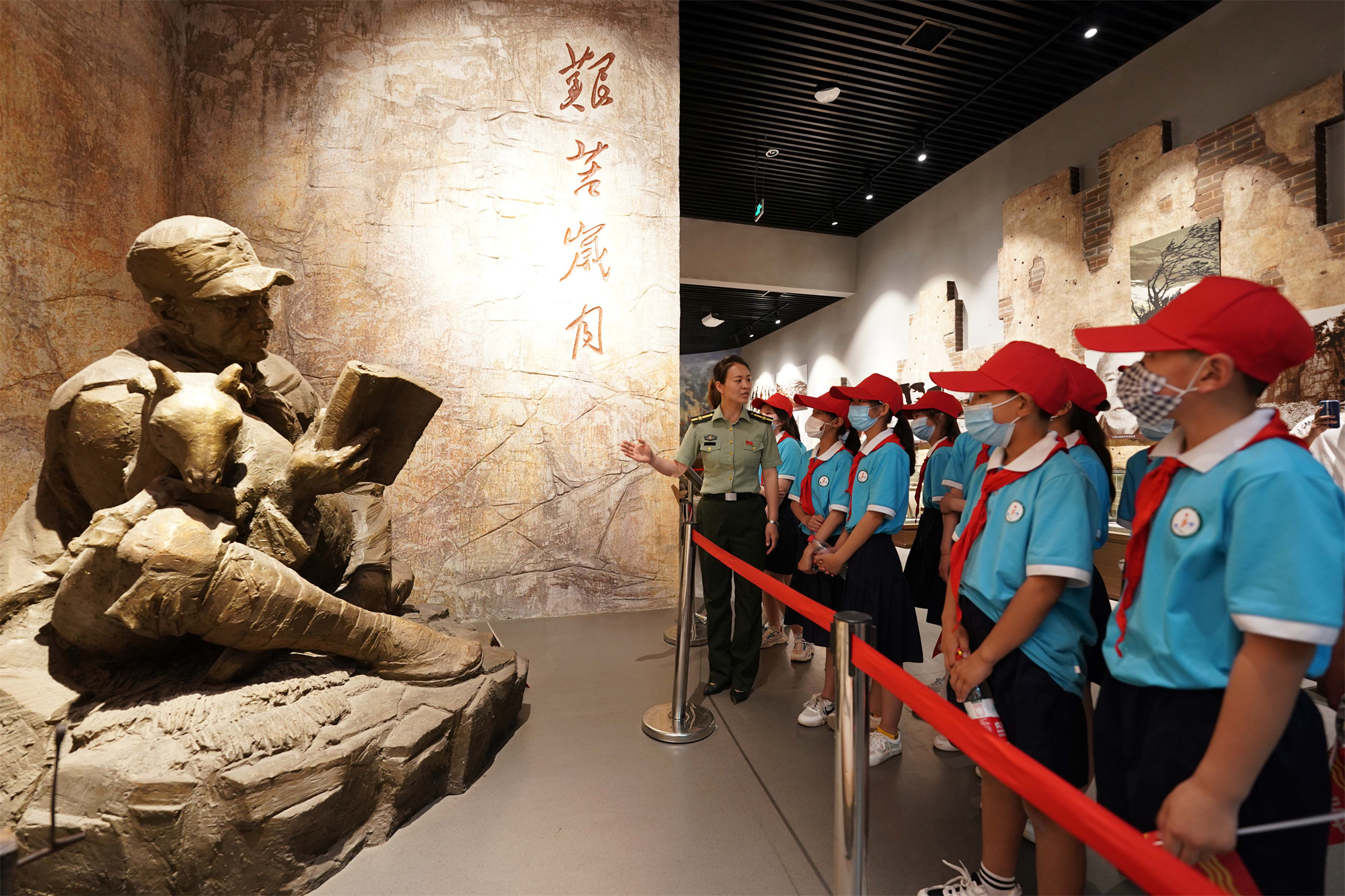 2021年5月30日,在位于河北省邢臺(tái)市信都區(qū)漿水鎮(zhèn)的中國(guó)人民抗日軍政大學(xué)陳列館,工作人員向小學(xué)生們講述抗大歷史。新華社記者 牟宇 攝