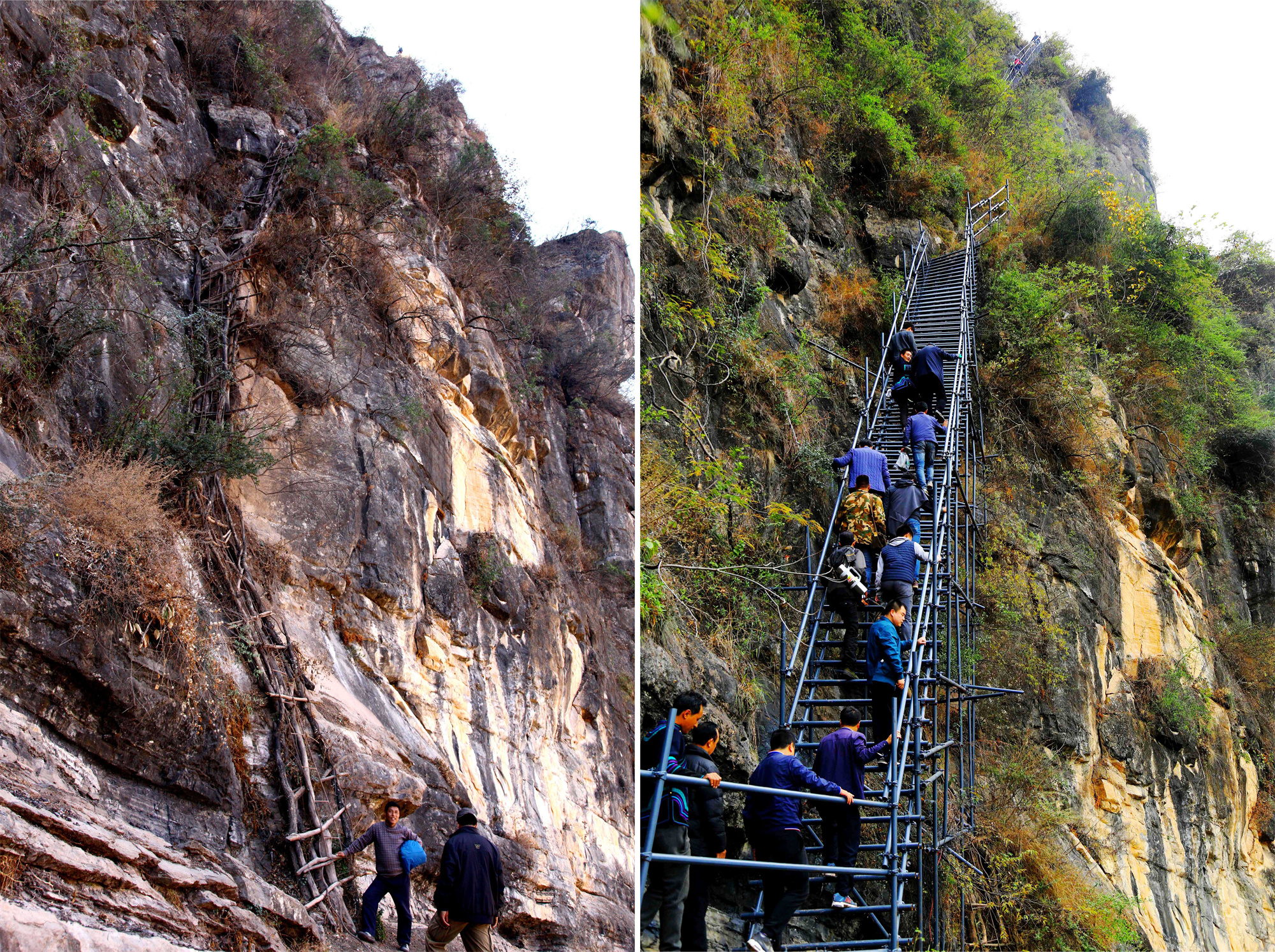 拼版照片:左圖為2013年2月22日拍攝的四川省涼山彝族自治州昭覺(jué)縣“懸崖村”阿土勒爾村的藤梯;右圖為2016年11月29日,在四川省涼山彝族自治州昭覺(jué)縣,人們沿著剛建好的鋼梯登上“懸崖村”。新華社發(fā)(阿克鳩射 攝)