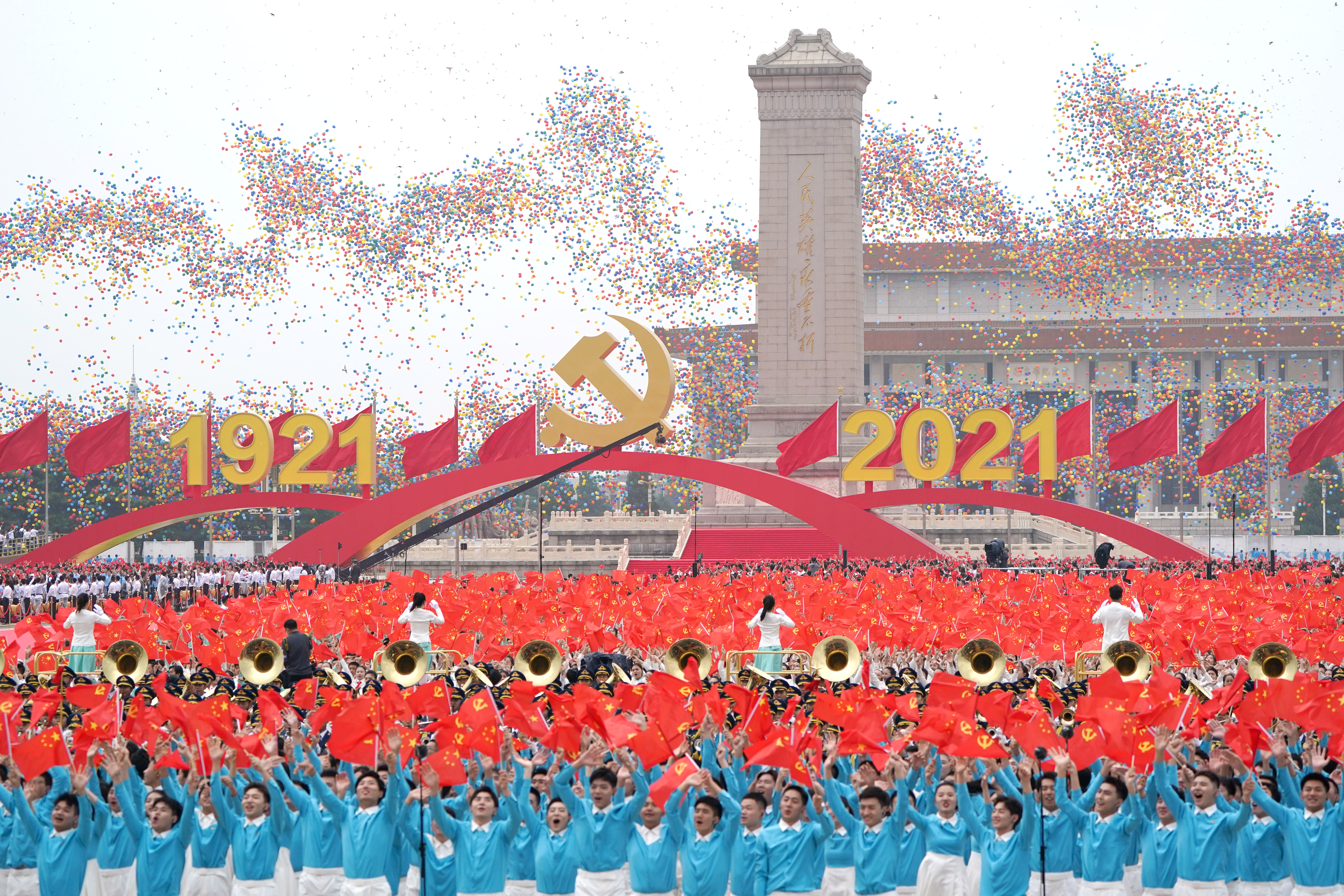 2021年7月1日上午,慶祝中國(guó)共產(chǎn)黨成立100周年大會(huì)在北京天安門廣場(chǎng)隆重舉行。這是慶祝大會(huì)現(xiàn)場(chǎng)放飛氣球。新華社記者 陳曄華 攝