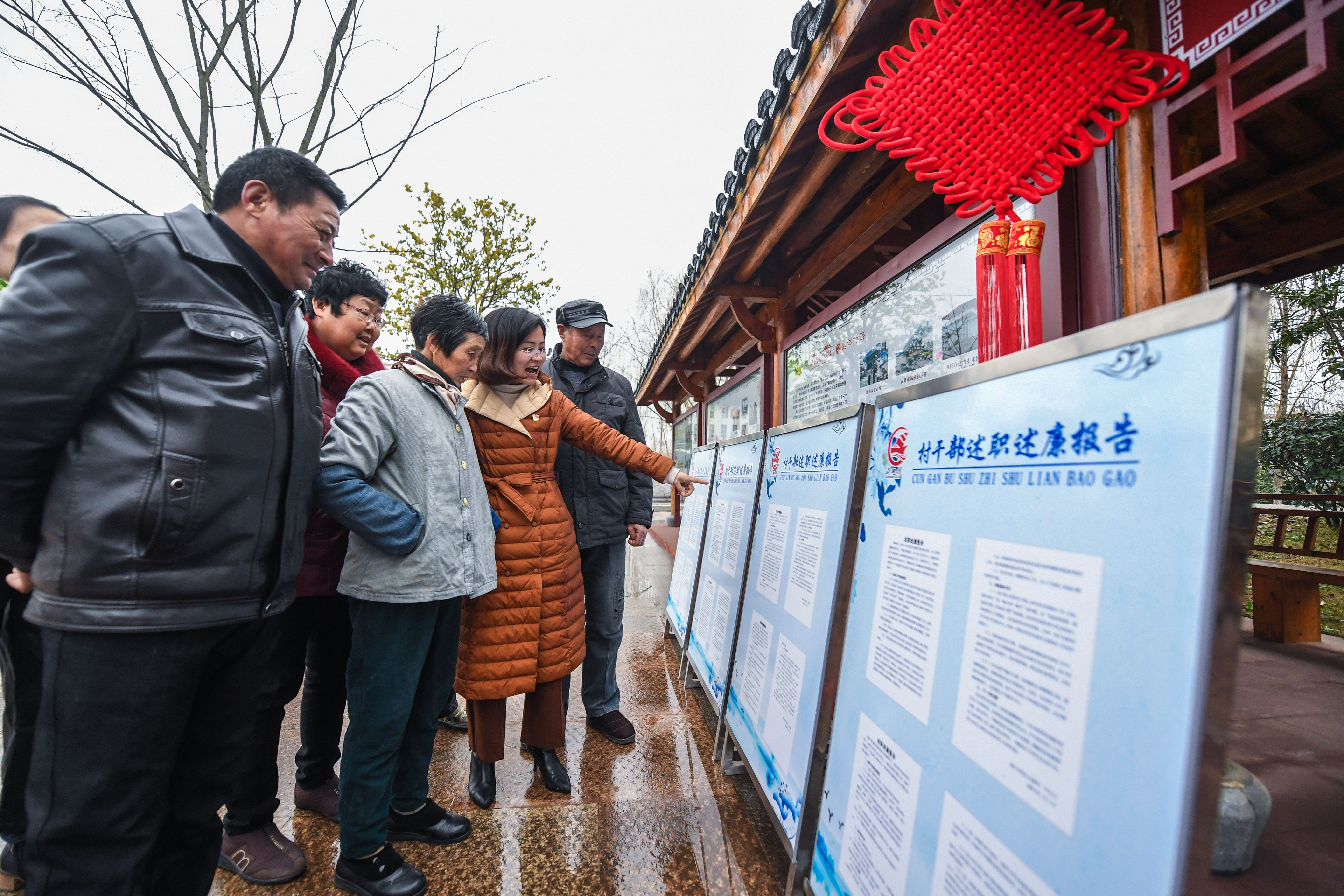 2019年1月15日,浙江省長(zhǎng)興縣虹星橋鎮(zhèn)港口村黨總支委員(右二)向村民介紹2018年度村干部述職述廉情況,接受村民監(jiān)督。新華社記者 徐昱 攝