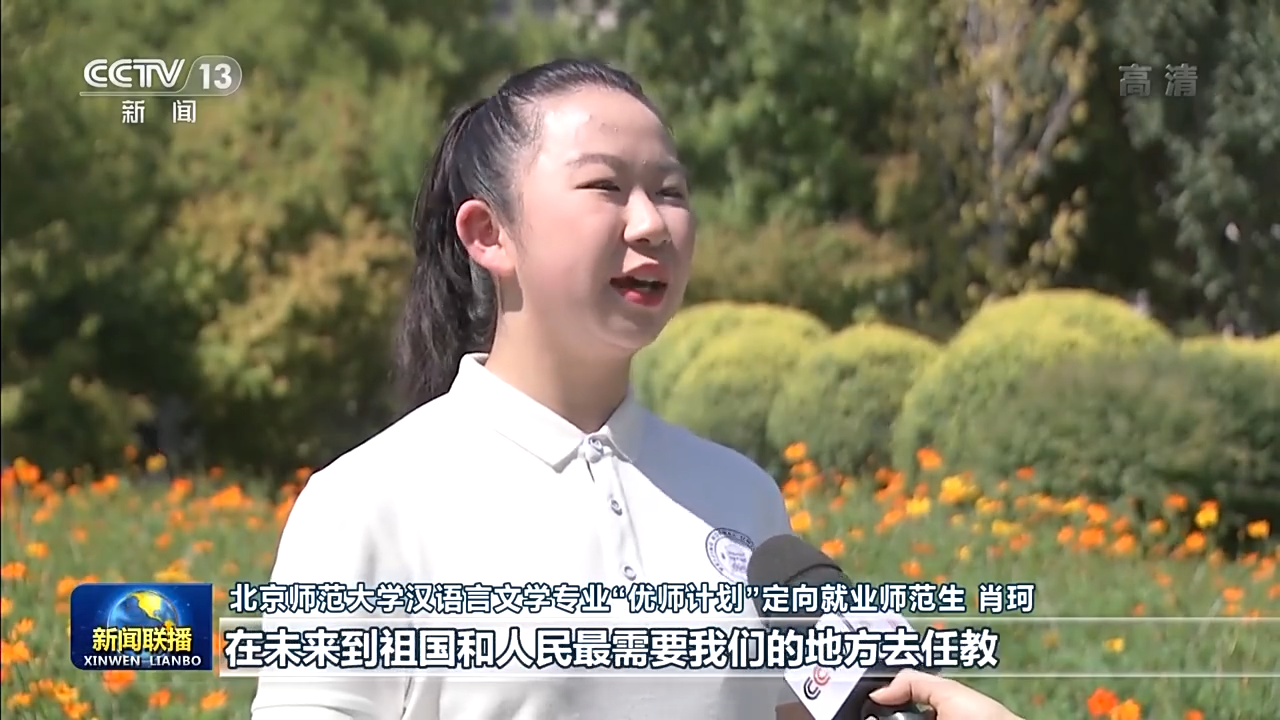 北京師范大學(xué)漢語(yǔ)言文學(xué)專業(yè)“優(yōu)師計(jì)劃”定向就業(yè)師范生 肖珂:總書(shū)記勉勵(lì)我們?cè)鲩L(zhǎng)傳道授業(yè)解惑本領(lǐng),在未來(lái)到祖國(guó)和人民最需要我們的地方去任教。我定不負(fù)囑托,努力學(xué)習(xí),在畢業(yè)后回到我的家鄉(xiāng)。