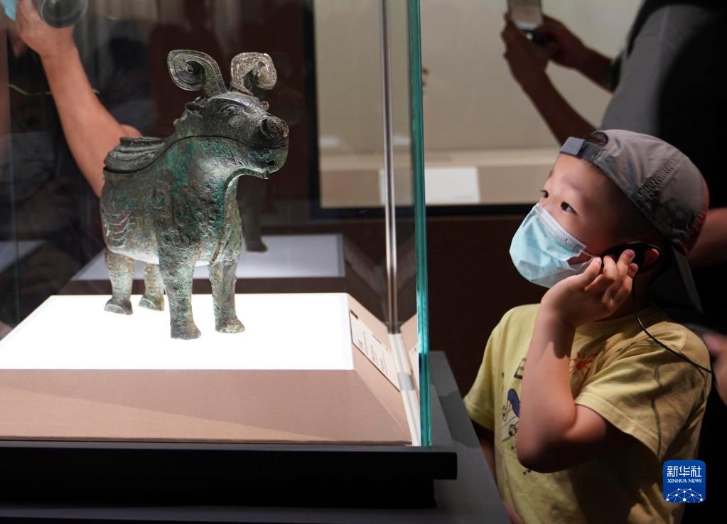 小朋友在上海博物館舉行的“宅茲中國——河南夏商周三代文明展”上參觀(2022年7月30日攝)。新華社記者 任瓏 攝