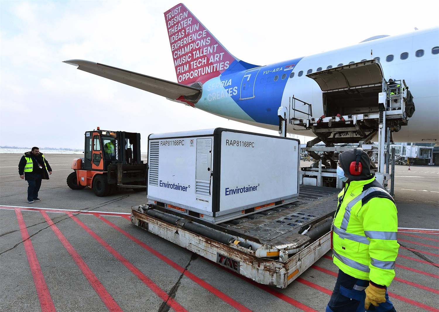 2021年1月16日,在塞爾維亞首都貝爾格萊德,機場工作人員卸載由中國國藥集團生產(chǎn)的新冠疫苗。新華社發(fā)(普雷德拉格·米洛薩夫列維奇攝)