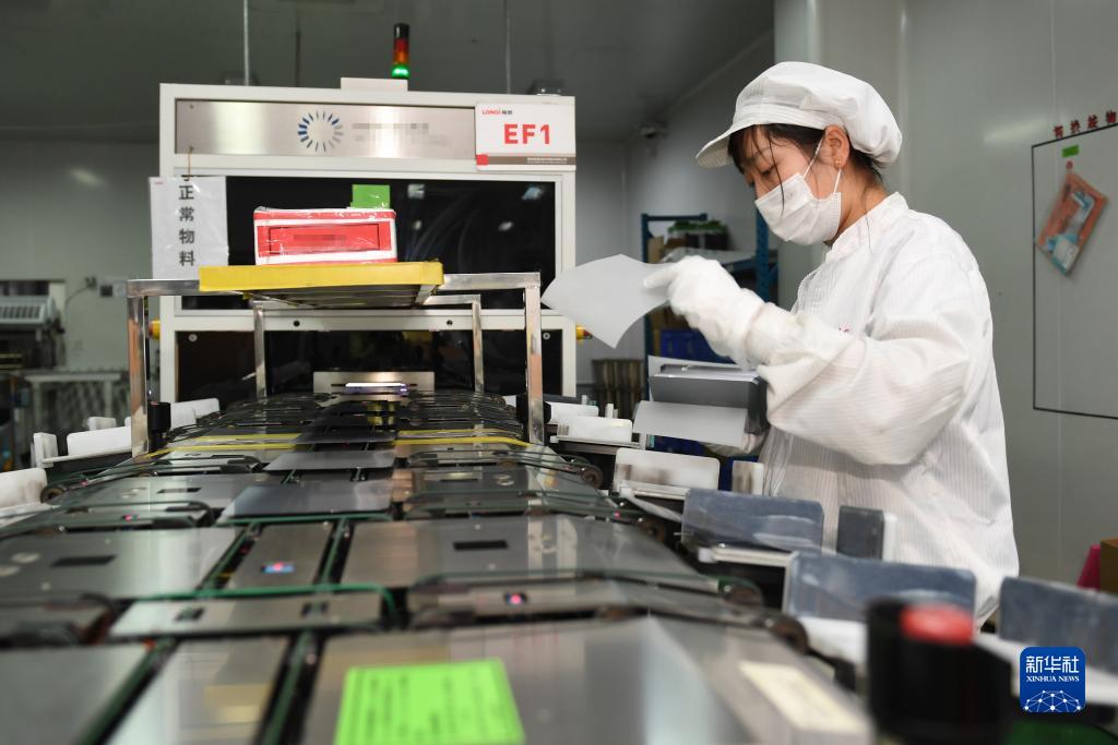 在隆基綠能科技股份有限公司西安切片工廠,工人在進(jìn)行檢測包裝作業(yè)(2022年1月18日攝)。新華社記者 李一博 攝