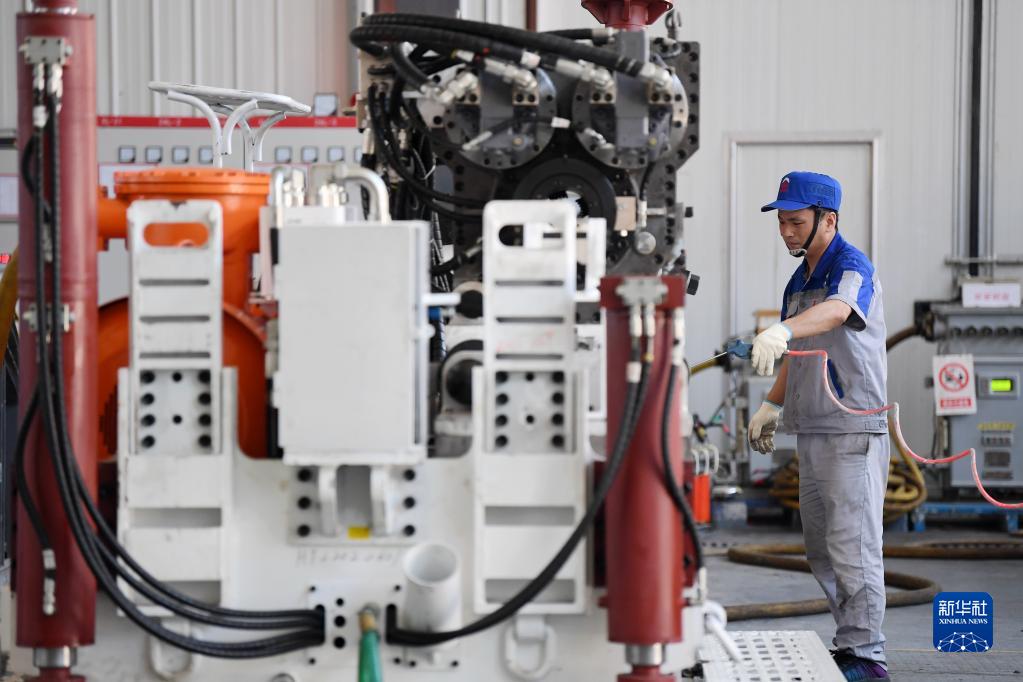 在位于秦創(chuàng)原總窗口所在地陜西省西咸新區(qū)的陜西太合智能鉆探有限公司,工人準(zhǔn)備對(duì)智能定向鉆機(jī)進(jìn)行性能調(diào)試(2022年6月17日攝)。新華社記者 李一博 攝
