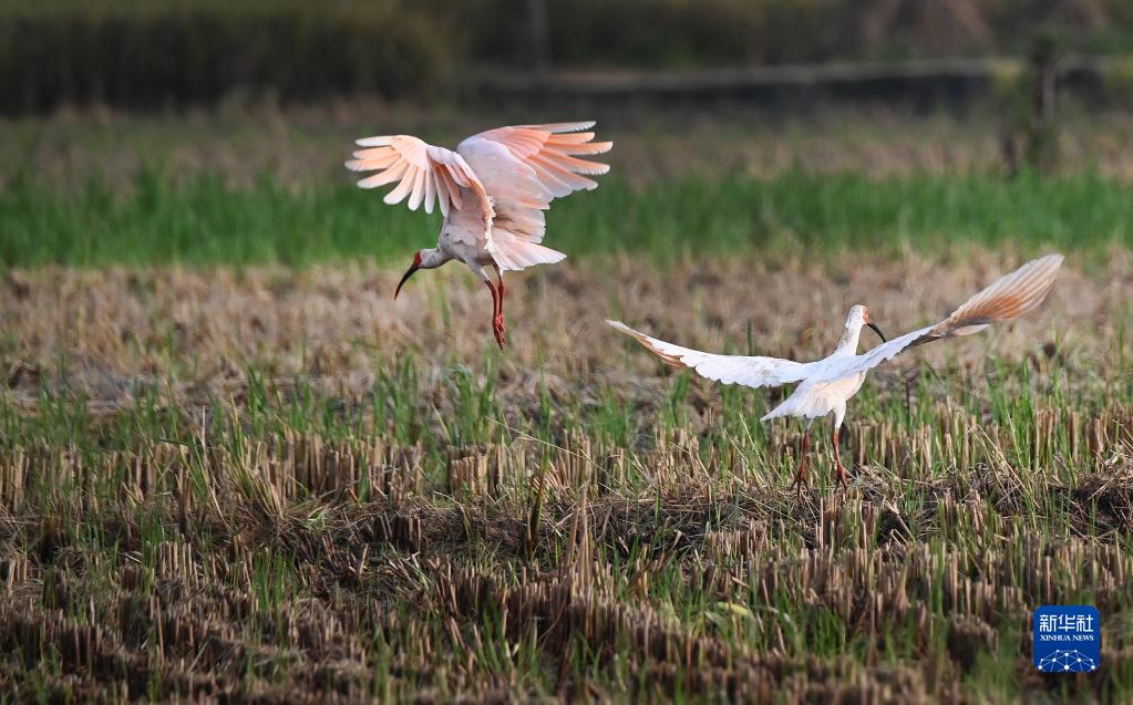 兩只朱鹮在陜西省洋縣謝村鎮(zhèn)一片收割后的稻田里嬉戲(2022年9月22日攝)。新華社記者 陶明 攝