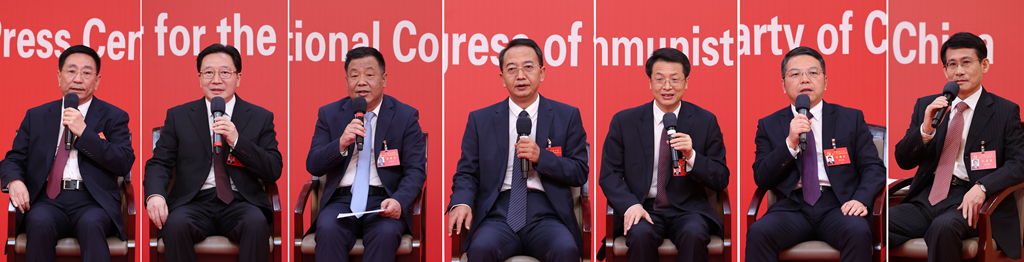 10月19日,中國(guó)共產(chǎn)黨第二十次全國(guó)代表大會(huì)新聞中心舉行集體采訪(fǎng)。山東、河南、湖北、湖南、廣東、廣西、海南代表團(tuán)新聞發(fā)言人出席,介紹代表團(tuán)學(xué)習(xí)討論二十大報(bào)告情況,并回答記者提問(wèn)(拼版照片)。新華社記者 張玉薇 攝