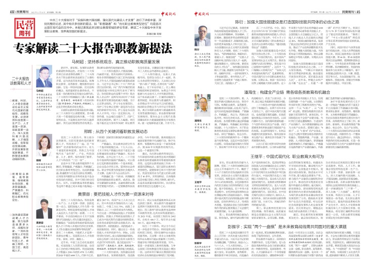 【《中國新聞》報(bào)記者 劉軍 報(bào)道】中共二十大報(bào)告對(duì)于“實(shí)施科教興國戰(zhàn)略,強(qiáng)化現(xiàn)代化建設(shè)人才支撐”進(jìn)行了詳細(xì)豐富、深刻完整的論述,其中有許多創(chuàng)新的提法,如“職普融通”和“優(yōu)化職業(yè)教育類型定位”均是首次出現(xiàn)在黨代會(huì)的文件中。本報(bào)記者就此采訪職業(yè)教育領(lǐng)域的多位專家,解讀二十大報(bào)告中關(guān)于發(fā)展職業(yè)教育、培養(yǎng)高技能的新提法。