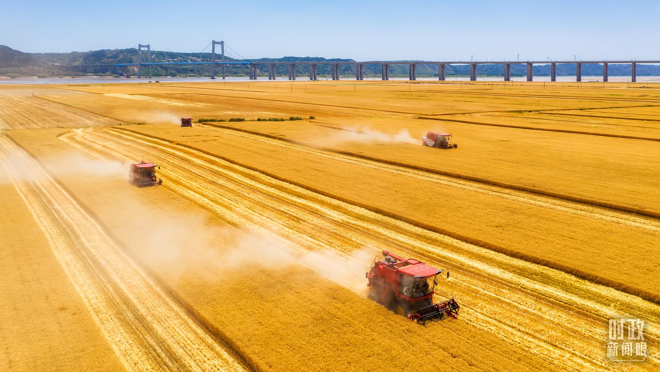 △位于河南省黃河河畔的麥田成熟,聯(lián)合收割機正在收割作業(yè)。(圖/視覺中國)