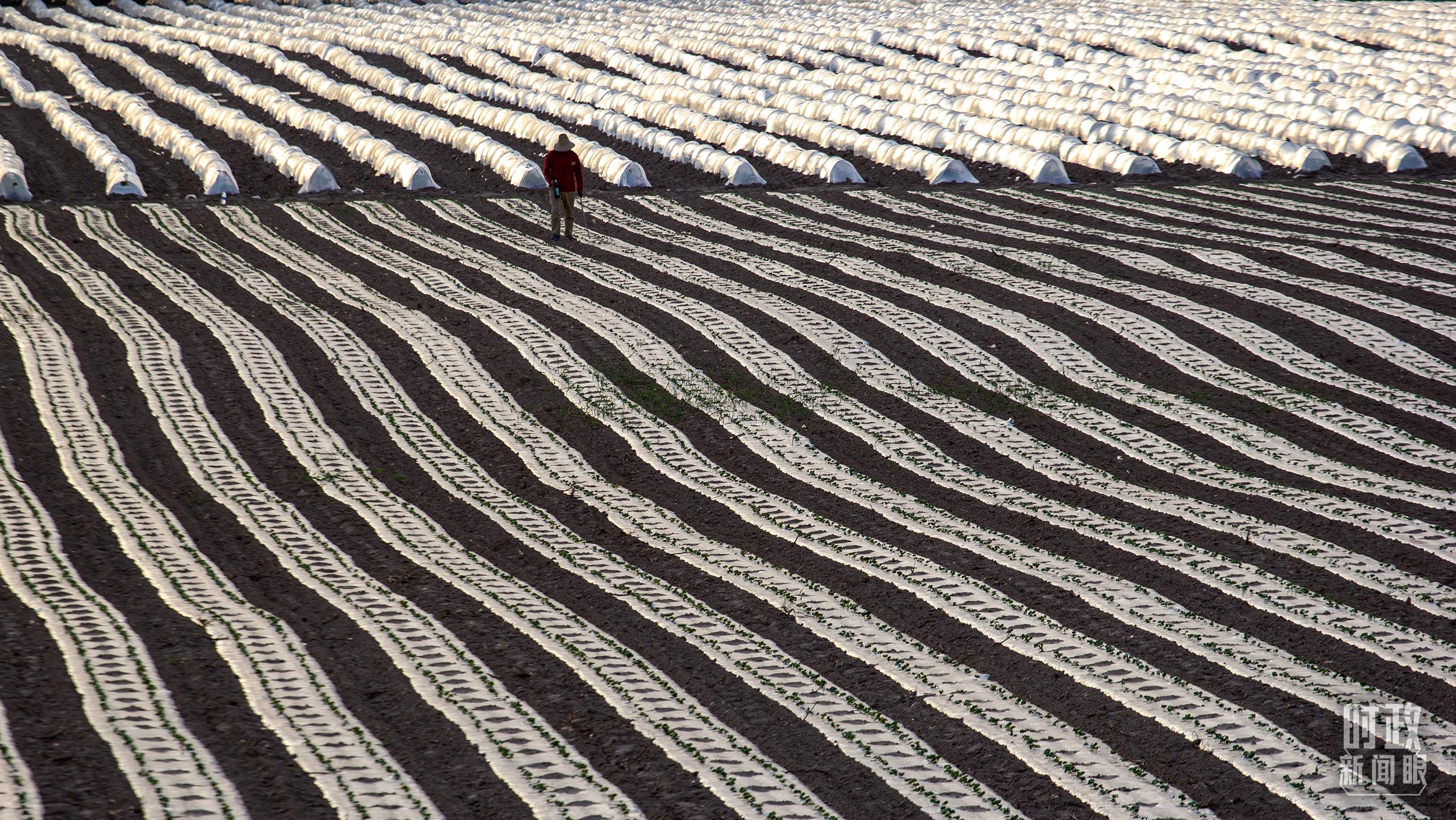 △山西省運城市農民在田間覆膜播種西瓜。(圖/視覺中國)