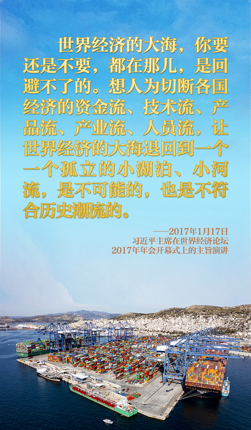 經(jīng)濟(jì)全球化何去何從?習(xí)近平主席在達(dá)沃斯論壇上作出明確回答:“世界經(jīng)濟(jì)的大海,你要還是不要,都在那兒,是回避不了的。想人為切斷各國(guó)經(jīng)濟(jì)的資金流、技術(shù)流、產(chǎn)品流、產(chǎn)業(yè)流、人員流,讓世界經(jīng)濟(jì)的大海退回到一個(gè)一個(gè)孤立的小湖泊、小河流,是不可能的,也是不符合歷史潮流的。”